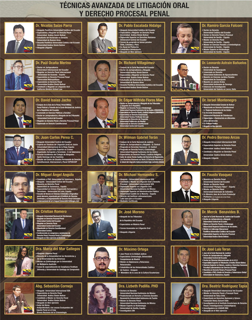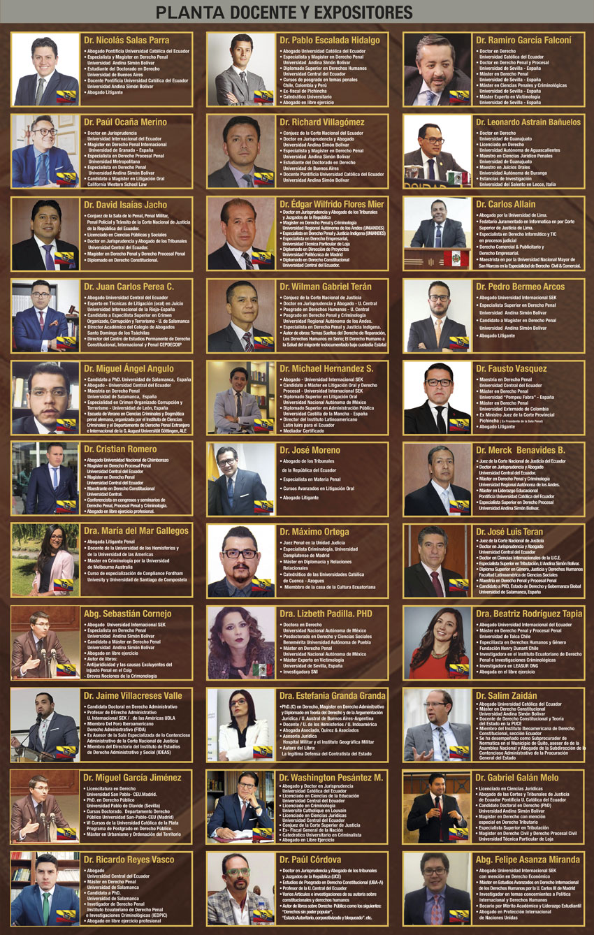 Nuestros equipo docente está conformado por instructores profesionales en derecho en distintas áreas de diferentes partes de Latinoamérica y Europa como Argentina, Bolivia, Chile, Colombia, Costa Rica, Ecuador, El Salvador, España (Europa), Guatemala, México, Paraguay, Perú, Puerto Rico, Uruguay.